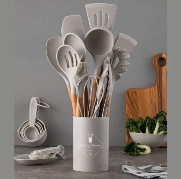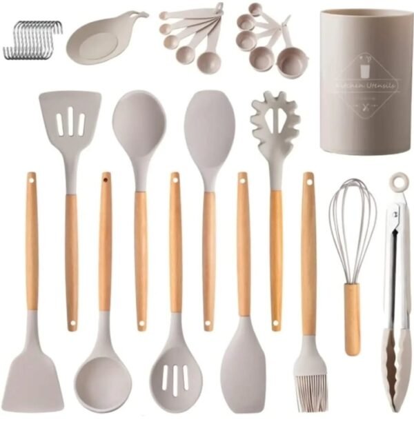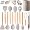 16 Pcs Silicone cooking utensils. Food grade with soft texture and wooden handle for a comfortable grip. Durable with high heat resistance. It includes measuring cups and hooks for easy storage.Color: Beige