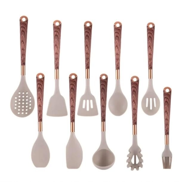11 piece premium food grade silicone kitchenware set, holder included. Our high heat resistant and non-stick cooking silicone spoons are non-toxic, BPA-free, dishwasher safe, and stands the test of time to give you years of use whilst adding elegance to your kitchen with a shiny gold-plated wood grain handle